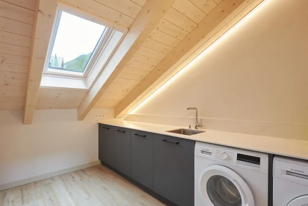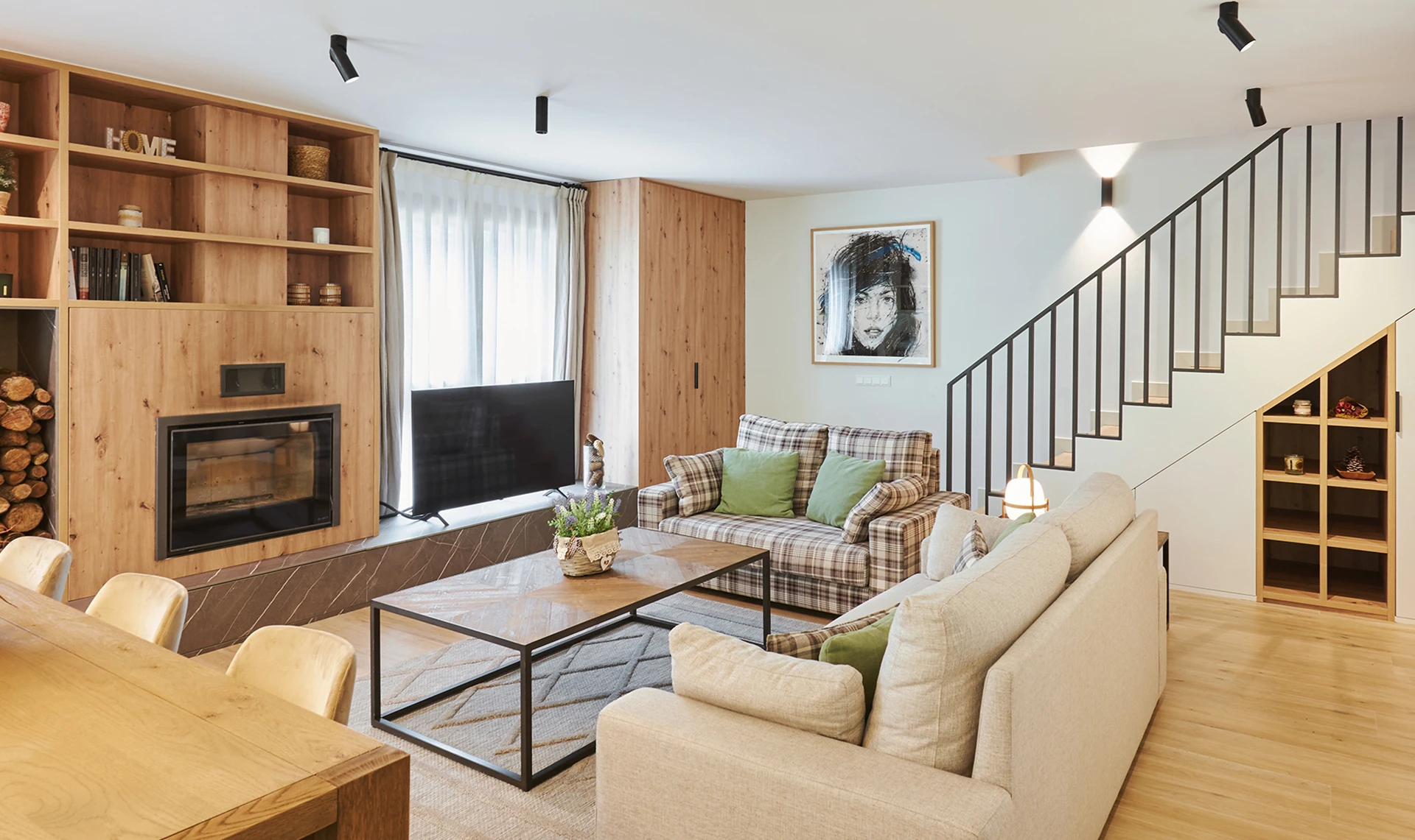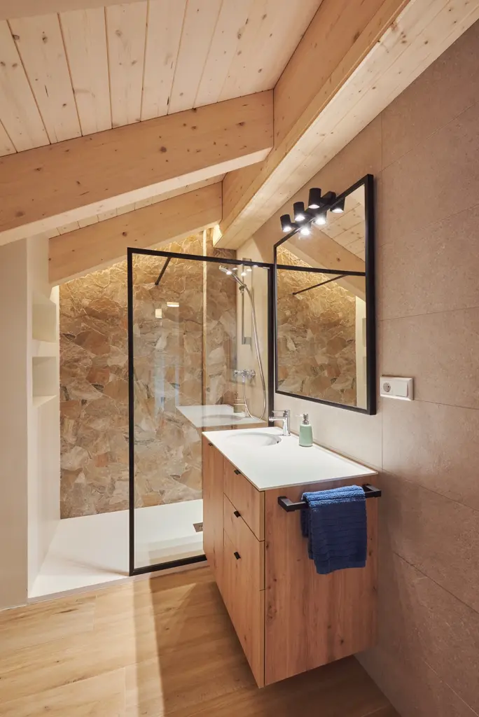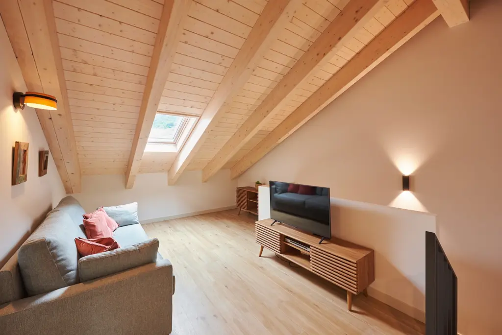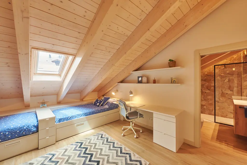 La planta superior abuhardillada, con cubierta de madera vista, y la chimenea como punto focal refuerzan el carácter acogedor de un hogar pensado para el confort y la vida en la montaña.