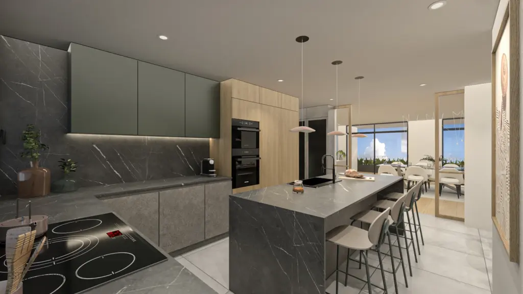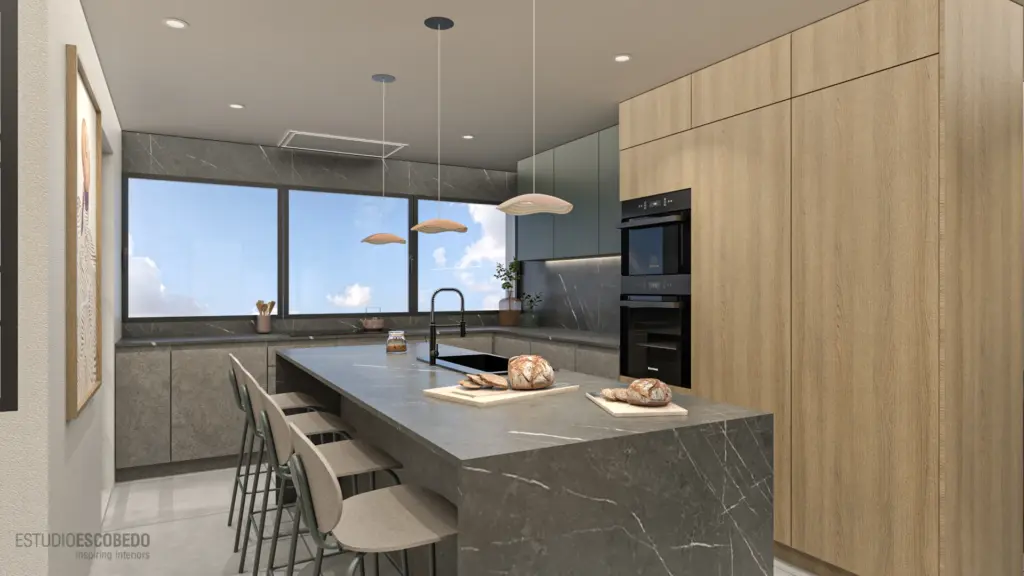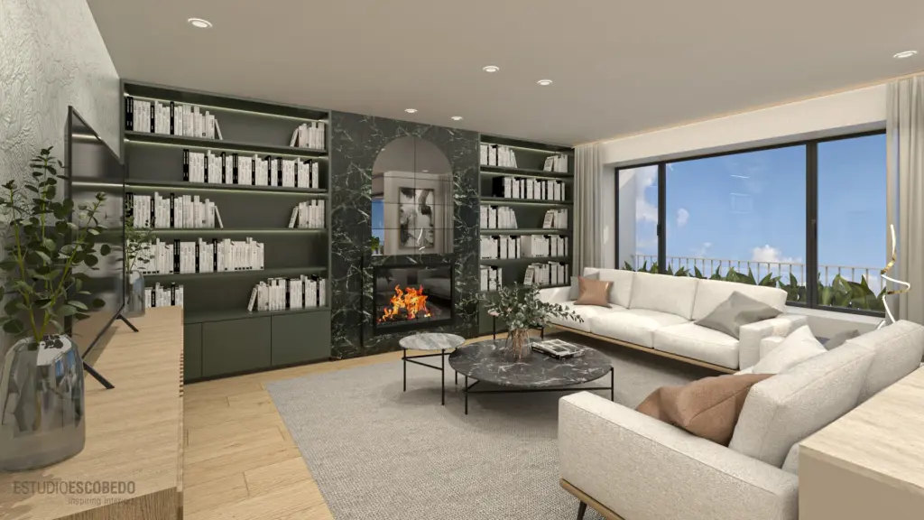 Este piso combina modernidad y elegancia con una paleta de colores neutros y oscuros que realzan el mobiliario minimalista.
