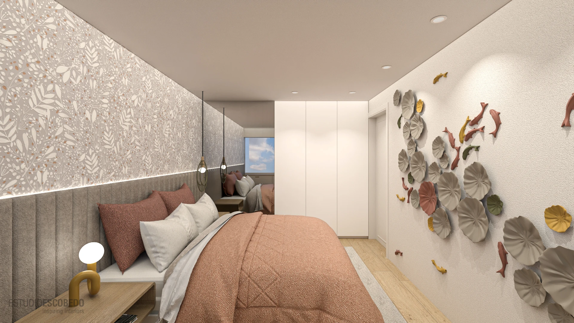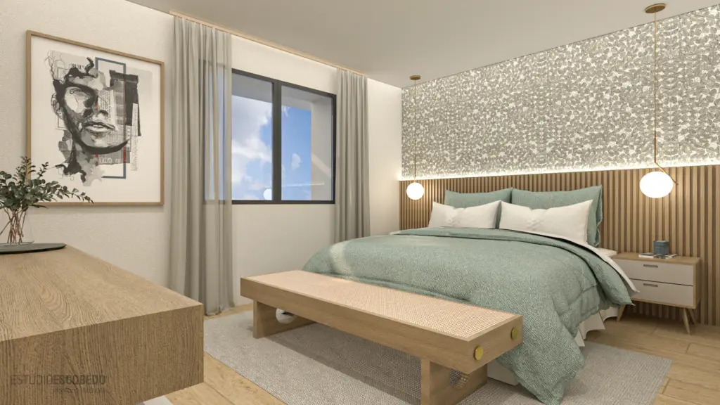 Paredes en tonos suaves aportan amplitud y luz, mientras la iluminación moderna crea ambientes cálidos.